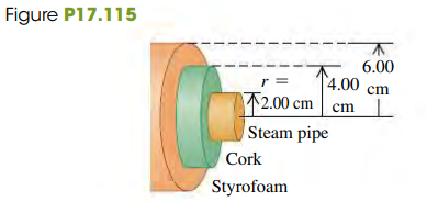 (d) A steam pipe with a radius of \(2.00\;cm\), carrying steam at \(140^\circ C\), is surrounded by a cylindrical jacket with inner and outer radii \(2.00\;cm\) and \(4.00\;cm\) and made of a type of cork with thermal conductivity \(4 \times 1{0^{ - 2}}\;{W \mathord{\left/{\vphantom {W {m \cdot K}}} \right.\\} {m \cdot K}}\) . This in turn is surrounded by a cylindrical jacket made of a brand of Styrofoam with thermal conductivity \(2.70 \times 1{0^{ - 2}}\;{W \mathord{\left/{\vphantom {W {m \cdot K}}} \right.\\} {m \cdot K}}\) and having inner and outer radii \(4.00\;cm\) and \(6.00\;cm\) (Fig. P17.115). The outer surface of the Styrofoam has a temperature of \(15^\circ C\). What is the temperature at a radius of \(4.00\;cm\), where the two insulating layers meet?