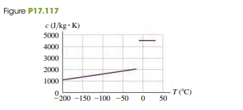 Careful measurements show that the specific heat of the solid phase depends on temperature (Fig. P17.117). How will the actual time needed for this cryoprotectant to come to equilibrium with the cold plate compare with the time predicted by using the values in the table? Assume that all values other than the specific heat (solid) are correct. The actual time (a) will be shorter; (b) will be longer; (c) will be the same; (d) depends on the density of the cryoprotectant.