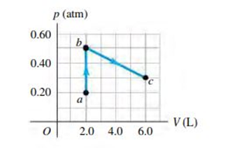 The process abc shown in the pV-diagram in Fig. E19.11 involves 0.0175 mol of an ideal gas. (a) What was the lowest temperature the gas reached in this process? Where did it occur? (b) How much work was done by or on the gas from a to b? From b to c? (c) If 215 J of heat was put into the gas during abc, how many of those joules went into internal energy?