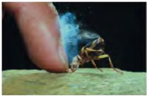 The African bombardier beetle (Stenotomus insignis) can emit a jet ofdefensive spray from the movable tip of its abdomen (Fig. P17.91). The beetle’s body has reservoirs containing two chemicals; when the beetle is disturbed, these chemicals combine in a reaction chamber, producing a compound that is warmed from 20ºC to 100ºC by the heat of reaction. The high pressure produced allows the compound to be sprayed out at speeds up to 19 m/s (68 km/h), scaring away predators of all kinds. (The beetle shown in Fig. 1 below is 2 cm long.) Calculate the heat of reaction of the two chemicals (in J/kg). Assume that the specific heat of the chemicals and of the spray is the same as that of water, , and that the initial temperature of the chemicals is 20ºC.