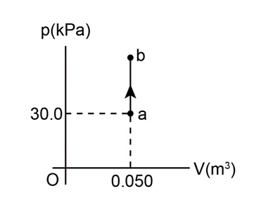An ideal gas is taken from a to b on the pV-diagram shown in Fig. E19.15. During this process, 700 J of heat is added and the pressure doubles. (a) How much work is done by or on the gas? Explain. (b) How does the temperature of the gas at a compare to its temperature at b? Be specific. (c) How does the internal energy of the gas at a compare to the internal energy at b? Be specific and explain.